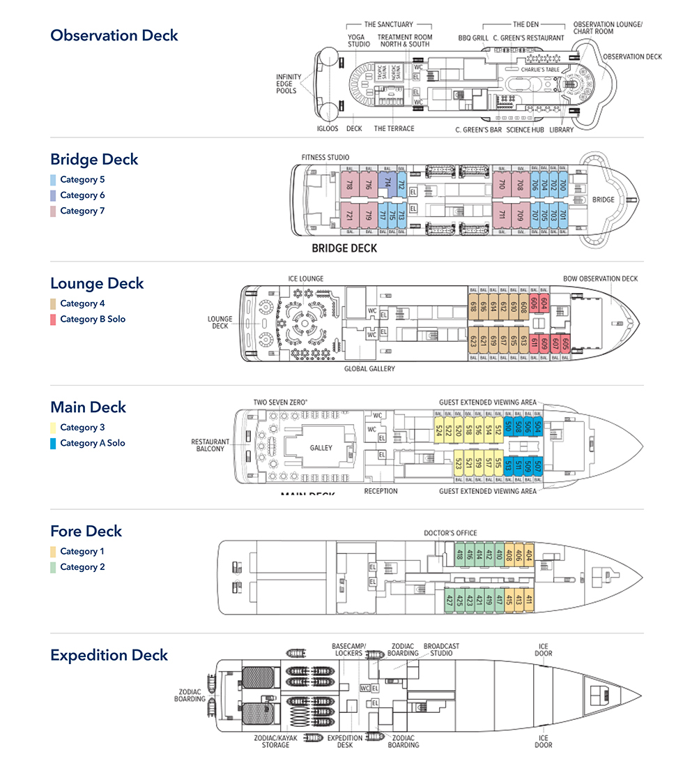 Specifically designed for polar expeditions, the National Geographic Endurance features the highest ice class rating and a unique design that ensures greater stability and comfort in polar waters. Cabins and public areas are equipped with large observation windows and spacious deck areas, offering unobstructed views of the polar landscape. In addition to the service crew, the ship also carries a professional photographer and onboard polar expedition experts.